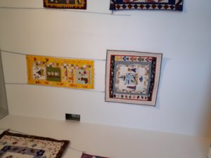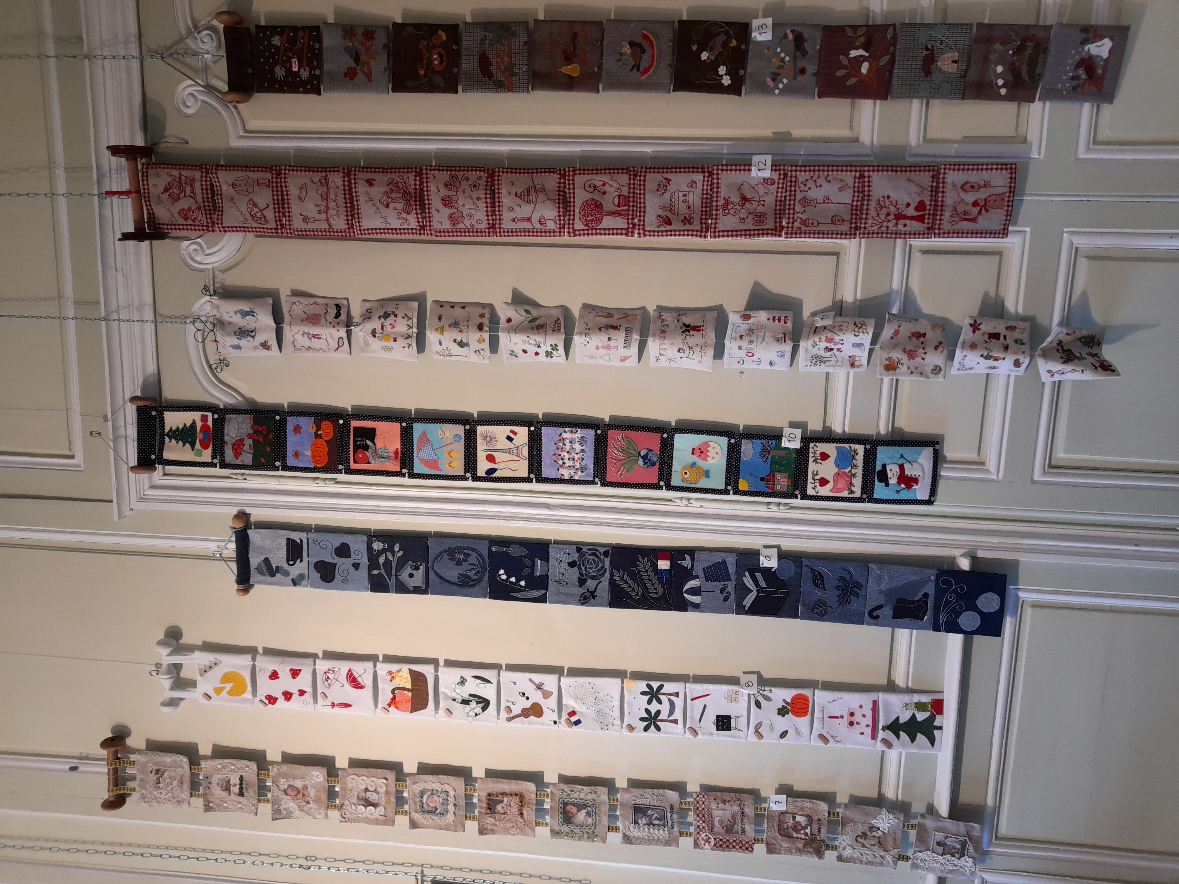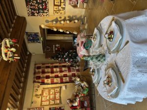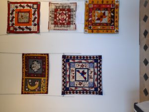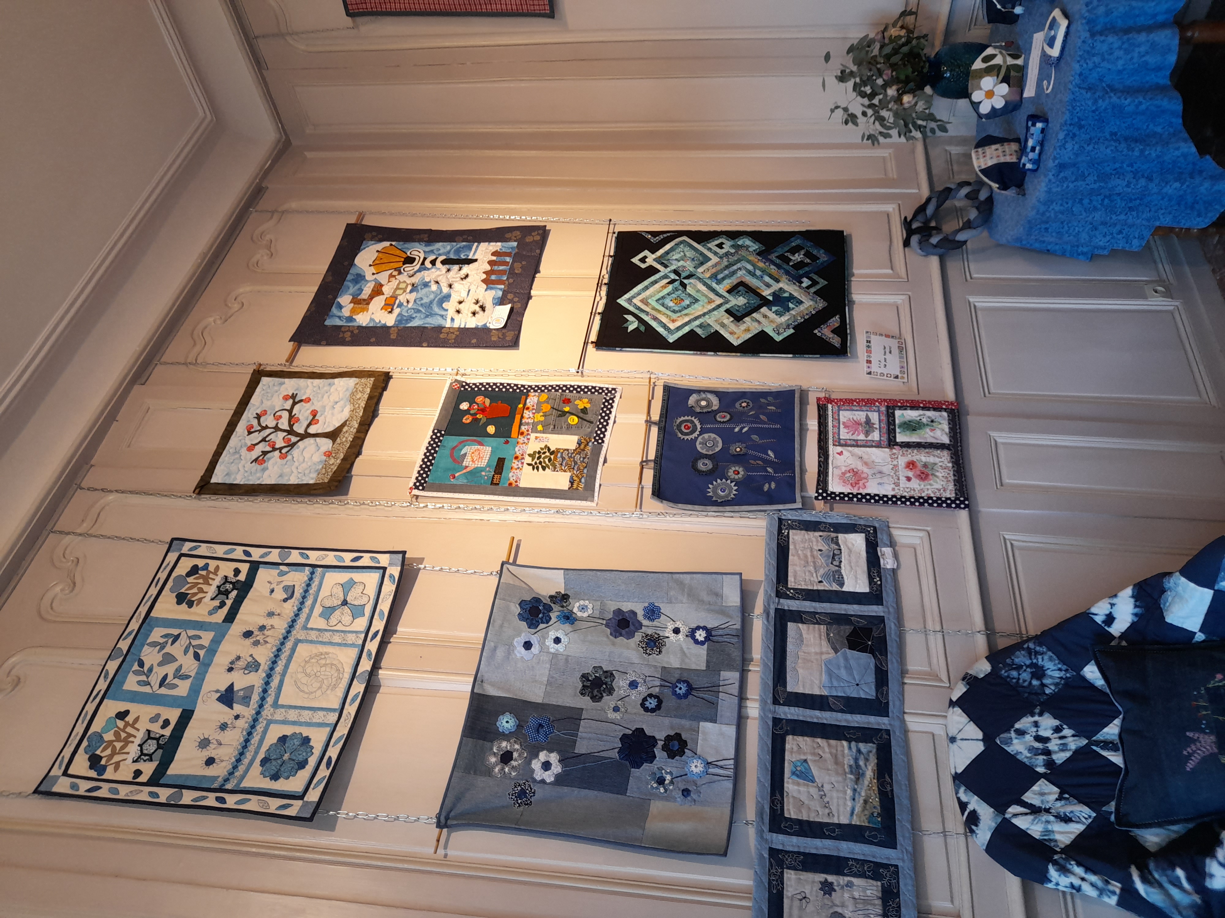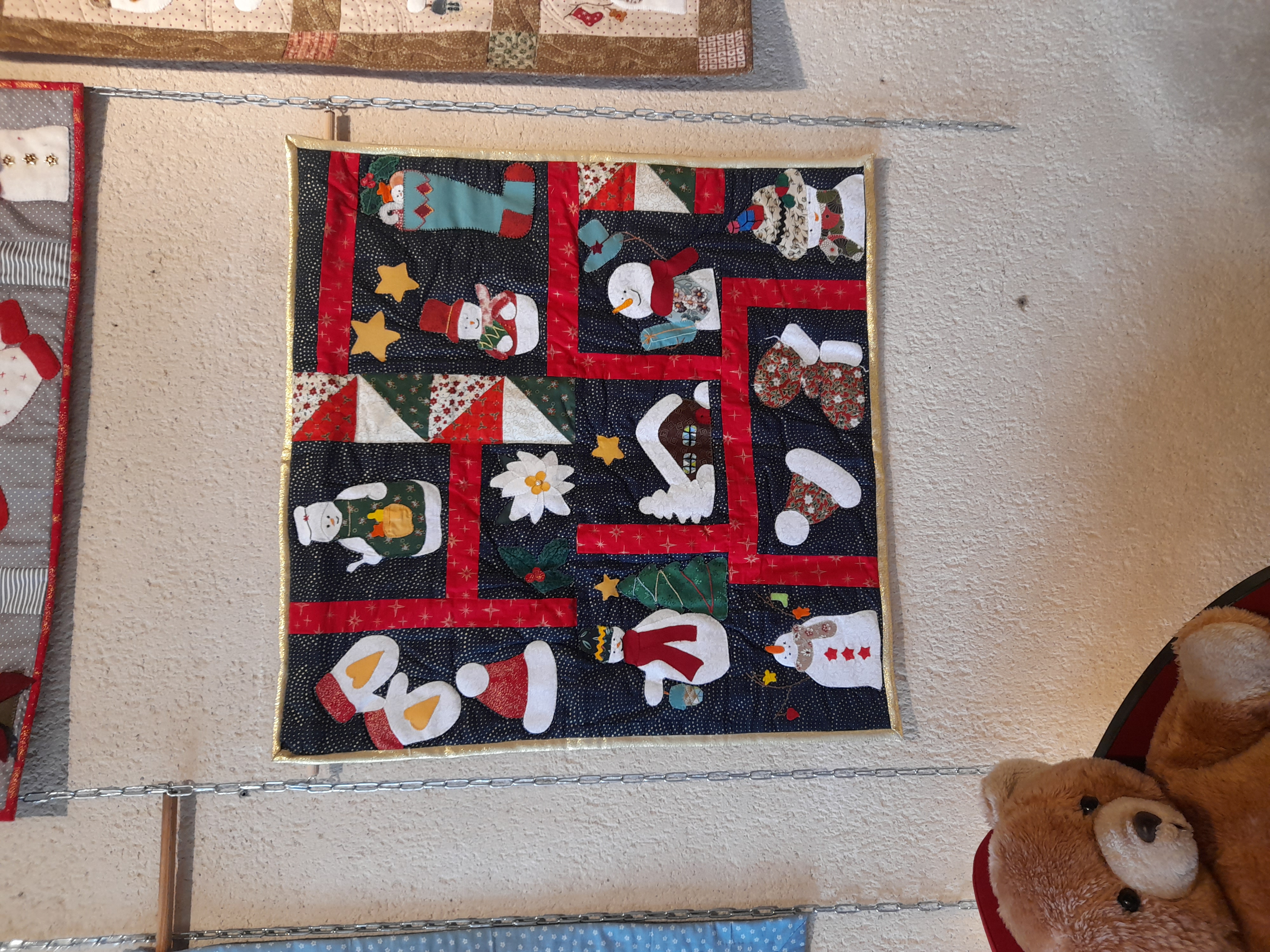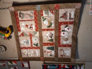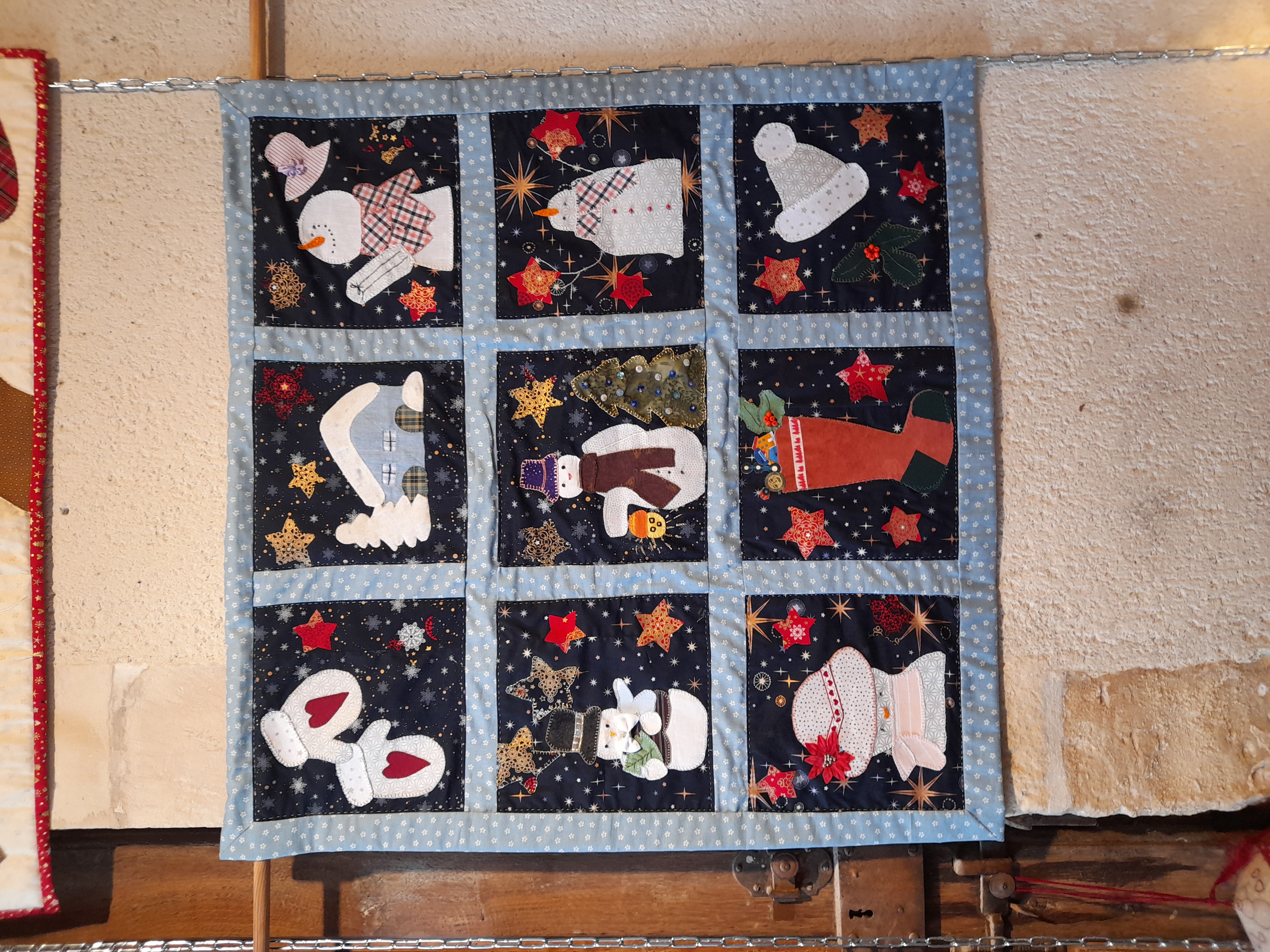 Quelques quilts mystères installés dans la salle Noël où il y a eu beaucoup d’animation :